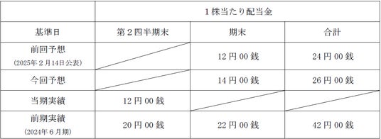当社は、財政状況や業績等を勘案しつつ、安定配当を継続することを株主の皆様への利益還元の基本方針としております。2025年6月期の期末配当予想につきましては、業績の動向や純資産配当率等を総合的に勘案し、従来予想より1株当たり2円増配し、年間配当金は24円から26円に修正することといたしました。