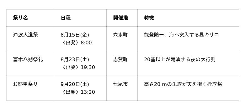 能登の創造的復興を目指す「のと100プロジェクト実行委員会」((一社)能登半島広域観光協会・能登DMC合同会社ほか)は、“#いま能登でできる100のこと”をテーマに、能登の祭りや暮らしを体感する一泊二日のツアー「のと物語」および、祭りの特別観覧ができる「お祭りバス&ローカルガイドツアー」を開催します。併せて、祭り参加の方法を伝えるイベント「のと100 MEET UP! vol.3」の配信を開始します。