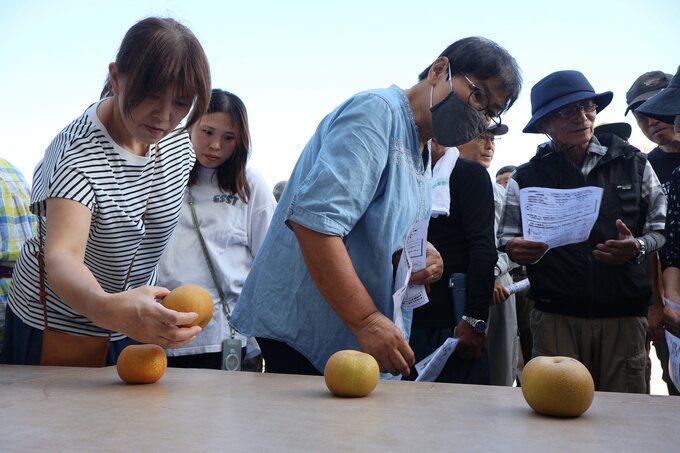 目ぞろい会には生産者ら約160人が参加。県富山農林振興センターの職員から、出荷の目安となるナシの色味や適切な収穫時期について説明を受けた。呉羽梨選果場の土田浩喜場長は「生産者は今年の猛暑対策として普段より水をまき、努力しておいしいナシに仕上げた。ぜひ食べてほしい」と話した。