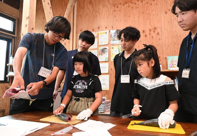 「魚さばき」コーナーでは、釣りが大好きで漁師の知り合いも多いという氷見高2年、中田輝(あきら)さん(17)が子どもたちにサバの三枚下ろしを指導。中田さんは「氷見で暮らすには魚は欠かせない食材。いかにおいしく食べるかを知る第一歩にしてほしい」と話した。