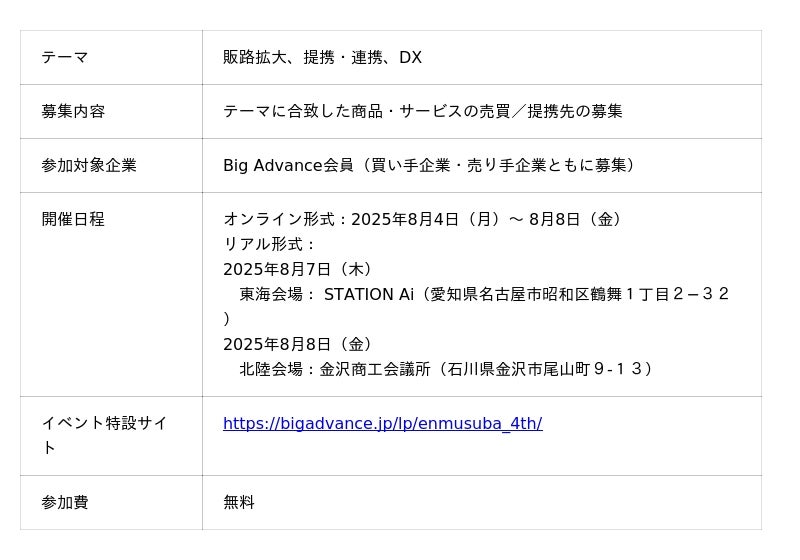 株式会社ココペリ(東京都千代田区、代表取締役CEO:近藤繁、以下ココペリ)は、中小企業向け経営支援プラットフォーム「Big Advance(ビッグアドバンス)」を導入している中部エリアの金融機関を中心とし、中小企業の新たな商談機会創出に向けた全国規模の商談会イベント『第4回えんむすBA ~中部地方から全国につながるオンライン商談会~』を2025年8月4日(月)から8日(金)の5日間開催しました。