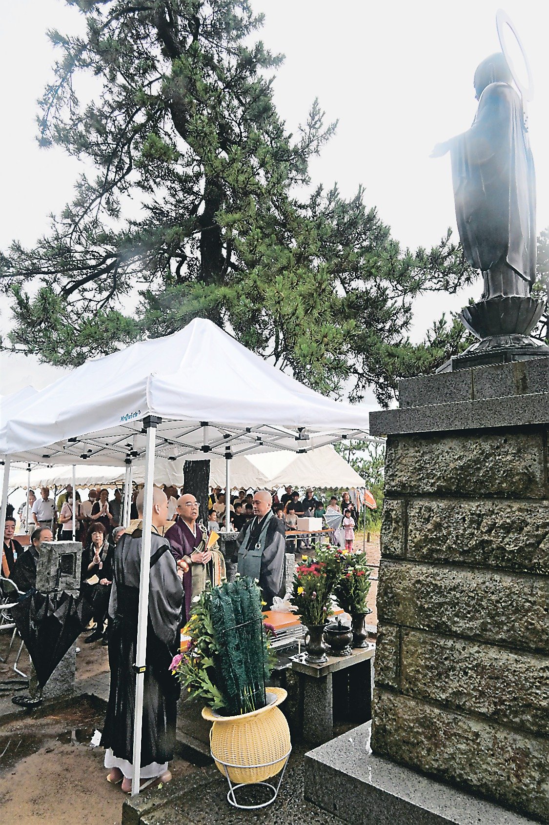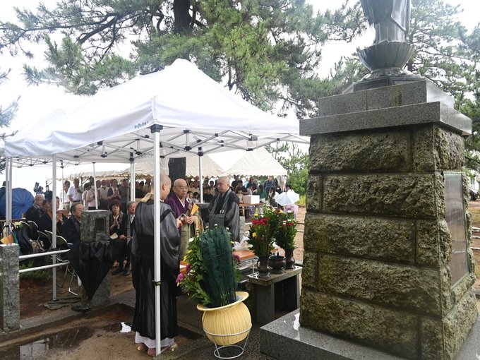 富山大空襲で亡くなり、氷見市の島尾海岸に流れ着いた犠牲者を供養する慰霊祭が12日、同市島尾海浜公園の地蔵尊像前で行われ、地元住民ら約100人が80年前の悲惨な記憶をつなぎ、平和への誓いを新たにした。