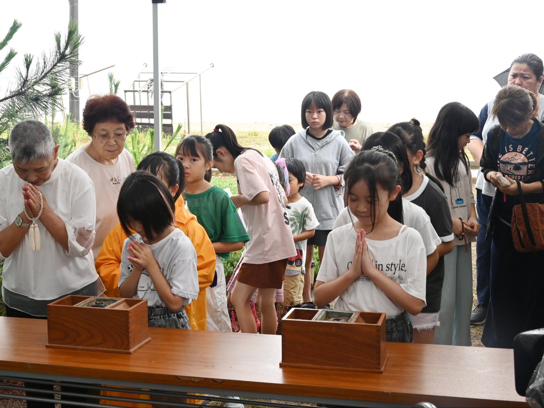 市街地から直線で約16キロ離れている島尾海岸には、11人の遺体が流れ着いた。生まれたばかりの赤子を胸に抱いた若い母や、離れぬよう手を縛り合った寝間着姿の幼い姉と弟もおり、住民は松の木の根元に埋葬した。空襲から30年たった75年、寄付を募って島尾海浜公園に地蔵尊像を建立。開眼法要を行った8月12日に毎年、地元の島尾自治会が中心となって慰霊祭を開いている。