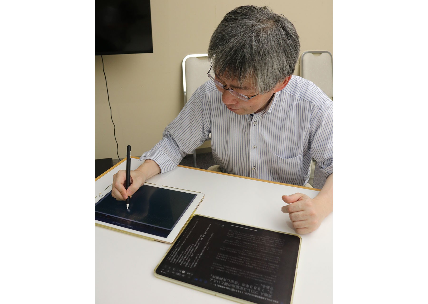2台のiPadとアップルペンシルを使い、天地人を書き写す福村さん