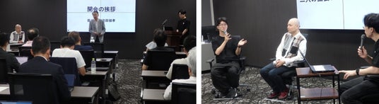 写真左は、参加者を前に冒頭あいさつする池田市長。写真右は、基調講演後にトークセッションで気さくに語り会う麻生氏(中央)と籔氏。