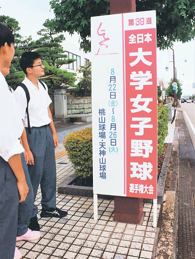 22日に富山県魚津市で開幕する第39回全日本大学女子野球選手権大会を盛り上げようと、同大会市実行委員会は魚津駅前通りなどにPRする看板を掲げた。