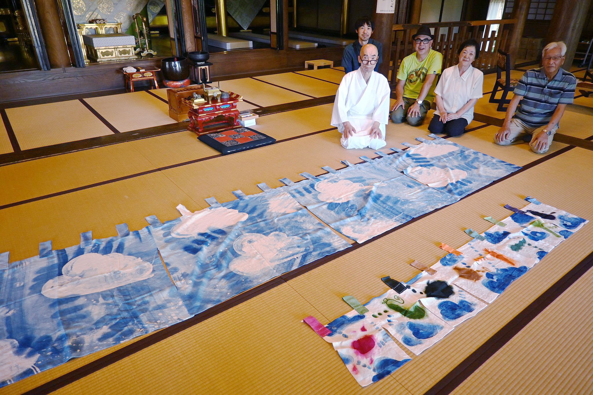 14日は、近所の檀家(だんか)らも駆け付け、約10人で藤原さんと取り付け作業を行った。2枚とも本麻を使っており、境内に吹く夏風を受けて優しく揺れていた。
