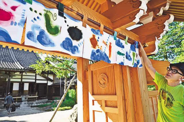 能登半島地震からの復興への願いを込め、美術家の藤原大さん=神奈川県=が、野菜や雲をモチーフにしたのれん2枚を制作し、富山県射水市串田の勝蓮寺に寄贈した。14日は藤原さんがのれんを設置しながら「この下で昔を思い出したり、これからのことを思ったりして、思い思いに眺めてほしい」と語った。