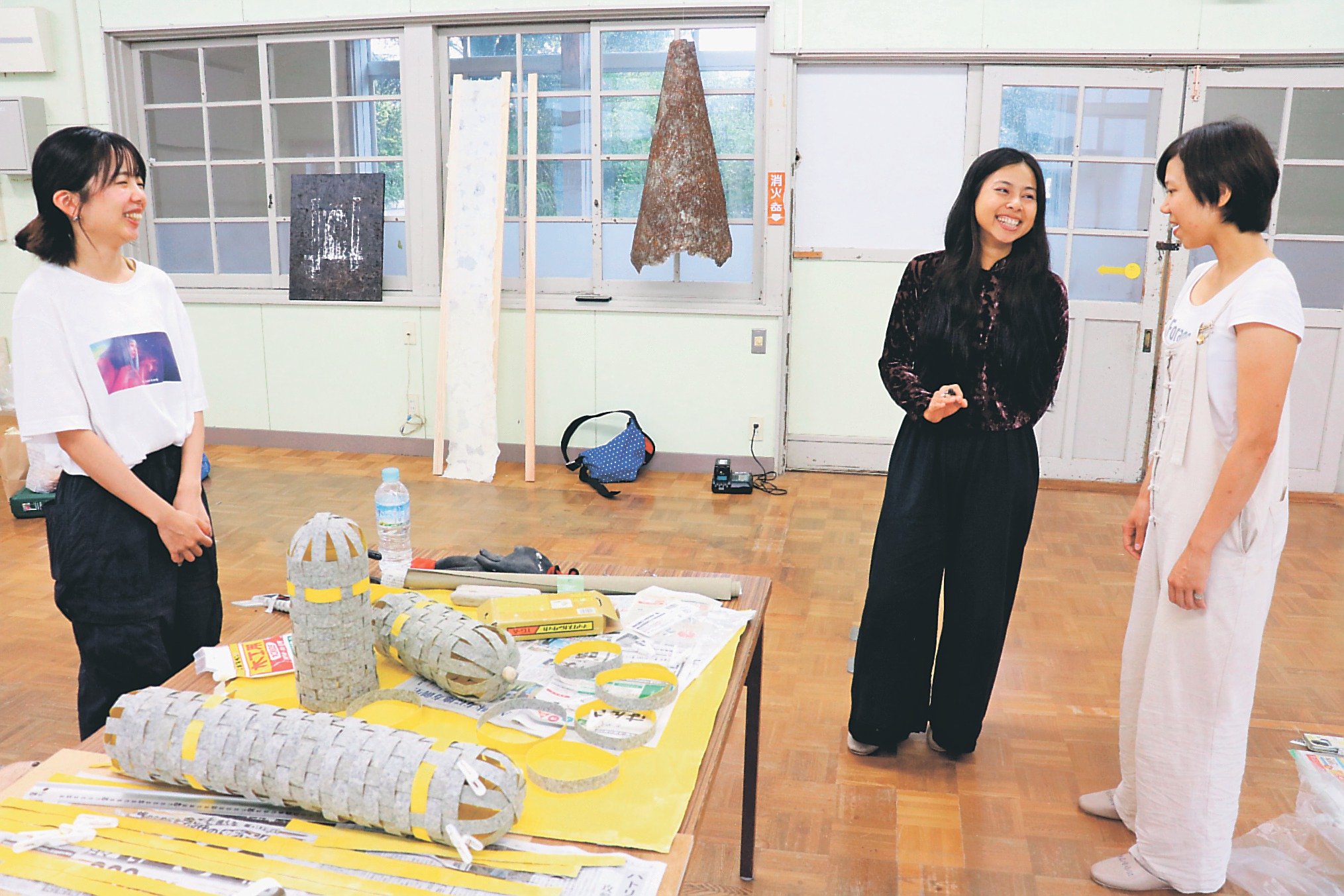 不動産業のアトム(東京)が開く学生向けの公募展の一環で、滑川市内での入賞者の滞在や公開制作を昨年から実施している。ことしは武蔵野美術大3年の湯川爽海(さなみ)さん(24)=東京=と、東京芸術大大学院修了の水野渚さん(35)=神奈川=が参加。市内で恒例の「ランタンまつり」で縁のあるベトナムからも公募し、音楽家のハ・トゥイ・ハンさん(36)が来県した。それぞれインスタレーション(空間芸術)を手がける。