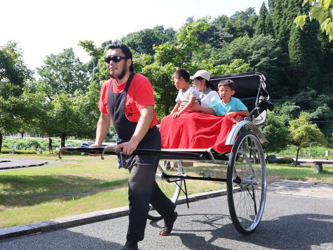富山県の南砺市福光美術館で開催中の漫画家・森みちこさん(同市北川)の作品展に合わせ、同館の周辺に隠されたかっぱのイラストを人力車に乗って探す催しが17日あり、親子連れらが楽しんだ。