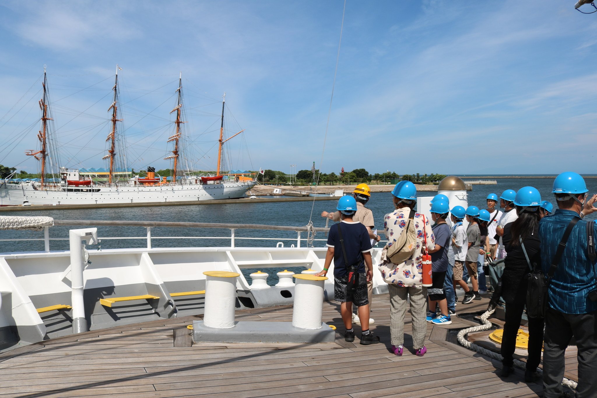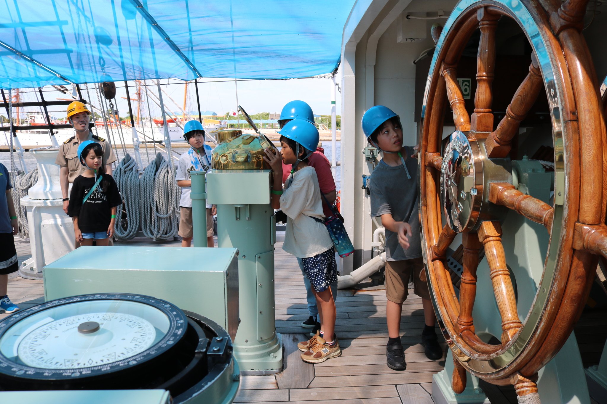 2代目海王丸では、乗組員の説明を聞きながら、デッキや機関室を見て回った。子どもたちは装置を動かしたり、見張り用の双眼鏡をのぞいたりして航海の気分を味わった。新湊放生津小学校6年の棚辺慶一さんは「初代の海王丸よりも大きくて広かった。どっちもかっこよくて好き」と話した。