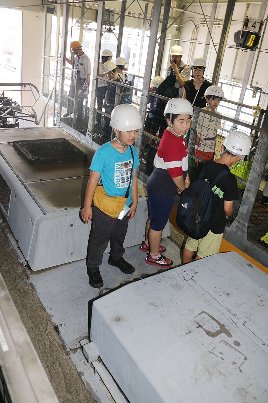 一行は、電鉄富山駅でアルプスエキスプレスに乗り、南富山駅で降車。駅に隣接する車両基地を見学した。車両整備士の疑似体験として路面電車の下に潜ったり、屋根に登ったりした。