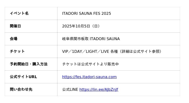 岐阜県関市板取のアウトドアサウナ施設「ITADORI SAUNA」にて、自然・サウナ・音楽・食・交流がひとつになる特別な一日「ITADORI SAUNA FES 2025」を、2025年10月5日(日)に開催します。