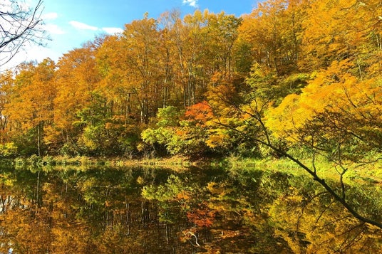 なべくら高原にひっそりと佇む茶屋池(ちゃやいけ)は、知る人ぞ知る紅葉の絶景スポットです。特にブナの美しい紅葉が水面に映り込む“逆さ紅葉”の光景は息をのむほど。