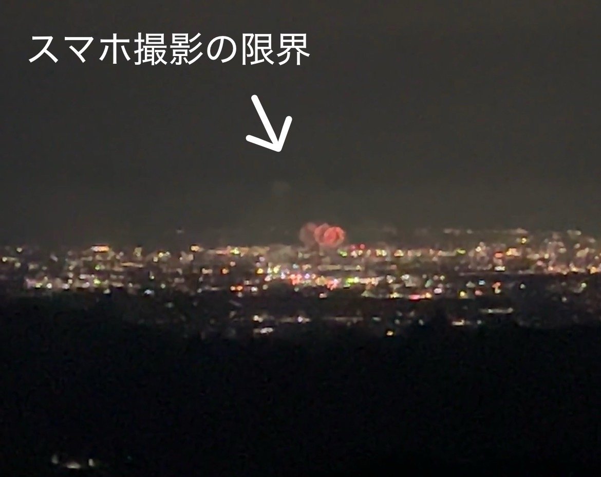 見晴らしの良い場所へ移動すると、目の前には富山市のキレイな夜景が広がり、遠くに赤い花のように花火があがっていました。