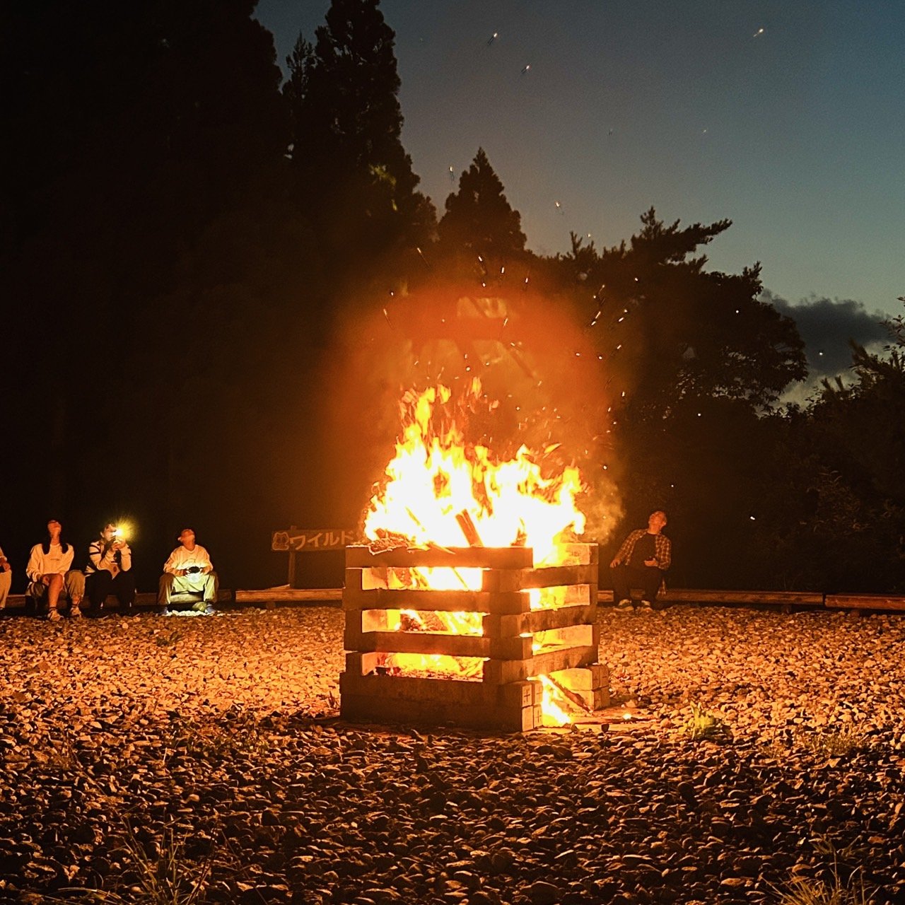 土台には豪快に薪木や雑木がくべられ、大きな炎が辺りを煌々と照らします。