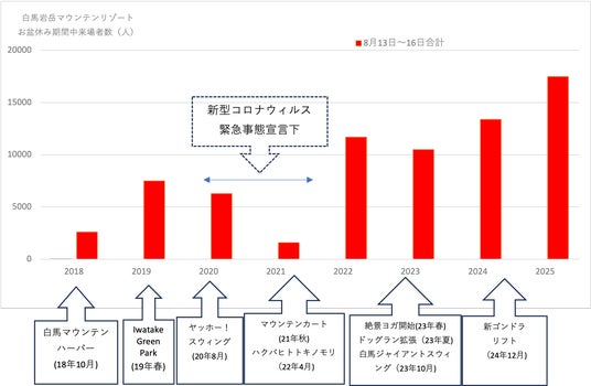 日本スキー場開発グループの株式会社岩岳リゾート(本社:長野県北安曇郡白馬村、代表取締役社長:星野裕二、以下「岩岳リゾート」)が運営する「⽩馬岩岳マウンテンリゾート」は、お盆休み期間の2025年8月13日~16日の4日間の来場者数が、過去最高の約17,800人に達し、昨対比133%を達成したことをお知らせいたします(※1)。また8月14日は5,620人が来場し、グリーンシーズンにおける1日あたりの最高来場者数を記録(対前比109% ※2)いたしました。