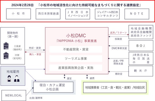 この取り組みは、小松市が掲げる2040年ビジョンの実現に向け、2024年2月に、石川県小松市(市長:宮橋 勝栄)、株式会社NOTE(代表取締役:藤原岳史)、西日本旅客鉄道株式会社(執行役員金沢支社長:石原利信)、株式会社JR西日本イノベーションズ(代表取締役社長:門間洋介)、ジェイアール西日本コンサルタンツ株式会社(代表取締役社長:加藤勇樹)が締結した「小松市の地域活性化に向けた持続可能なまちづくりに関する連携協定」に基づくものです。