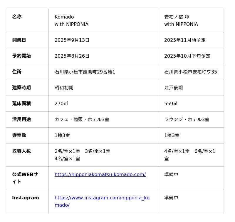 また、今秋には市内の安宅エリアにて、北前船主の屋敷を改修した古民家宿泊施設「安宅ノ宿 沖with NIPPONIA」の開業も予定しており、各施設を起点に小松市の活性化事業を面的に展開していきます。