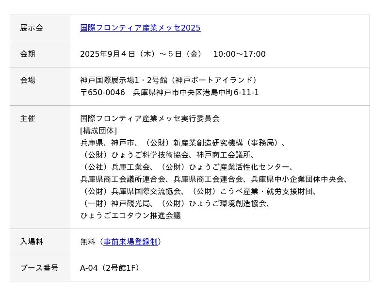 株式会社テクノア(本社:岐阜県岐阜市、代表取締役:山崎 耕治)は、9月4日~5日に神戸国際展示場(神戸ポートアイランド)で開催される「国際フロンティア産業メッセ2025」に出展いたします。