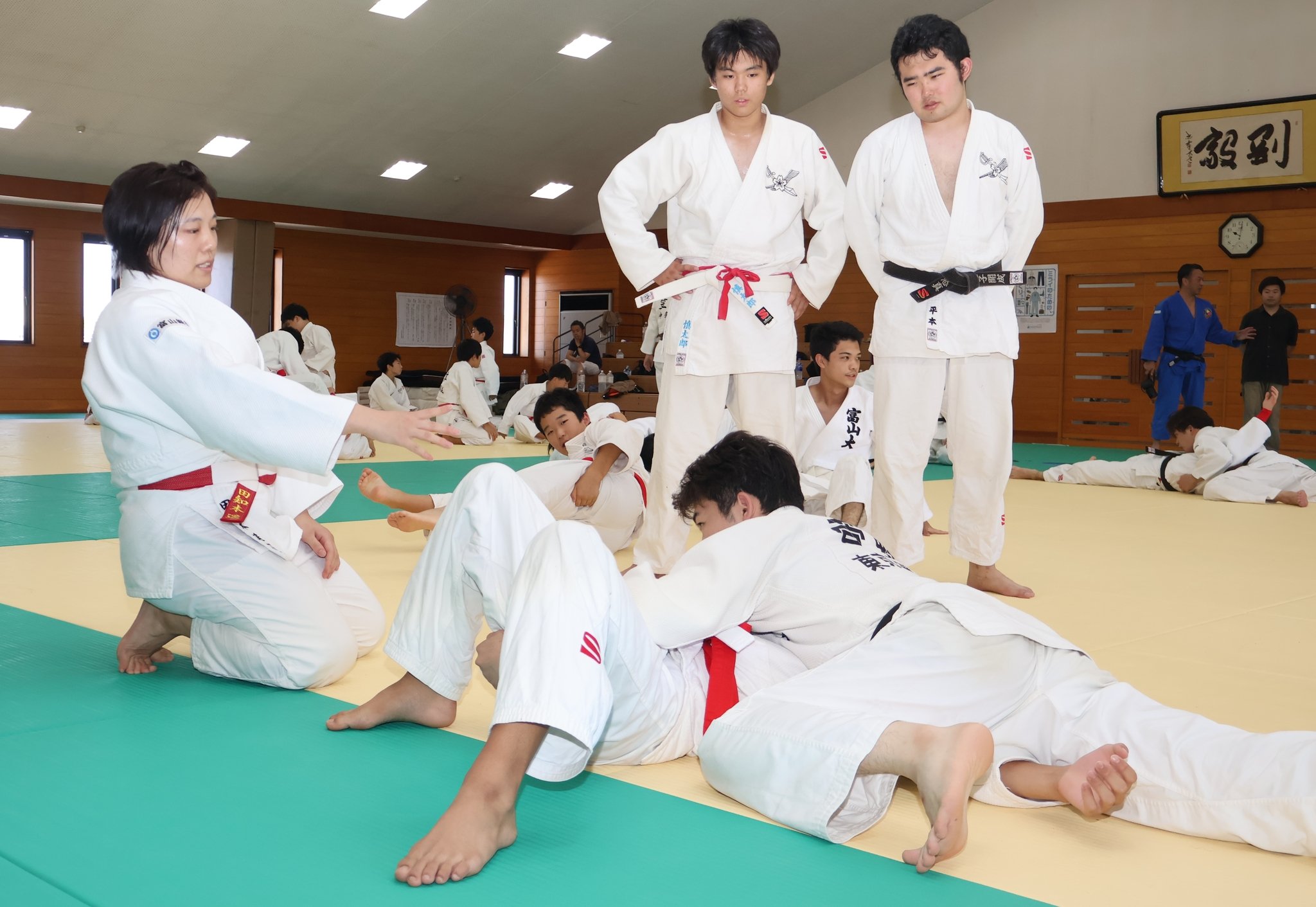 柔道の「文武両道富山合宿」が、高岡市石瀬の塩谷建設正気館道場で行われている。22日は富山県内外からの参加者が、リオ五輪柔道女子70キロ級の金メダリスト、田知本遥さん(射水市出身)から指導を受けた。