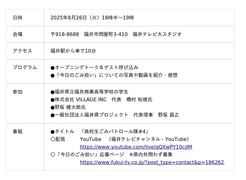 福井県内の高校生によるごみ拾い活動を応援し、海洋ごみ問題への関心を深めることを目的に、「高校生ごみパトロール隊」が5月から始動。これまで、海洋ごみ問題に対して高校生一人ひとりの意識は高いものの、活動が個々にとどまり、継続的かつ広がりのある取り組みが課題となっていました。そこで本企画では、高校生が主役となって、ごみ拾いの様子を発信し合い、連携を深めていく新しいコンテンツを立ち上げます。活動内容は、高校生がごみ拾いを行い、その日の活動を「今日のごみ拾い」として写真や動画で投稿。その様子を毎月1回30分間の特別番組にまとめて、YouTubeで生配信し、主体的にごみ問題に取り組める環境を目指します。4回目となる今回はゲストに8月に実施した『高校生記者ごみ拾い動画制作講座』に参加してくれた福井県立福井商業高等学校の学生と株式会社VILLAGE INC 代表 橋村 和徳氏を招き、ごみ拾いについて深掘りしていきます。