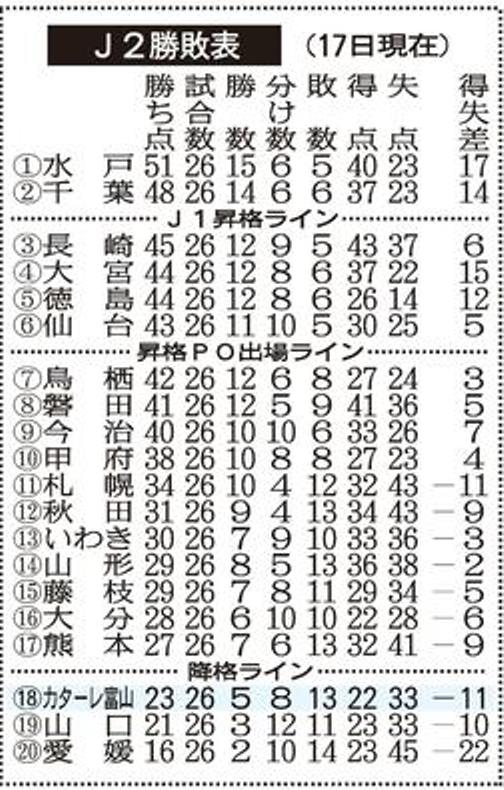 カターレは今季38試合のうち26試合を終えて勝点23(5勝8分13敗)の18位につけている。18~20位の下位3クラブがJ3に降格するため、残留するには最低でも17位に上がらなければならないが、現時点で17位・熊本と勝点4差、16位・大分と同5差がついている。追い付くにも最短で2試合が必要で、残り試合数を考えるとこれ以上離されるのは避けたい。23日にアウェーで行われる第27節・磐田戦と30日にホームで熊本と直接ぶつかる第28節が、残留を目指す上で最初のヤマ場になる。