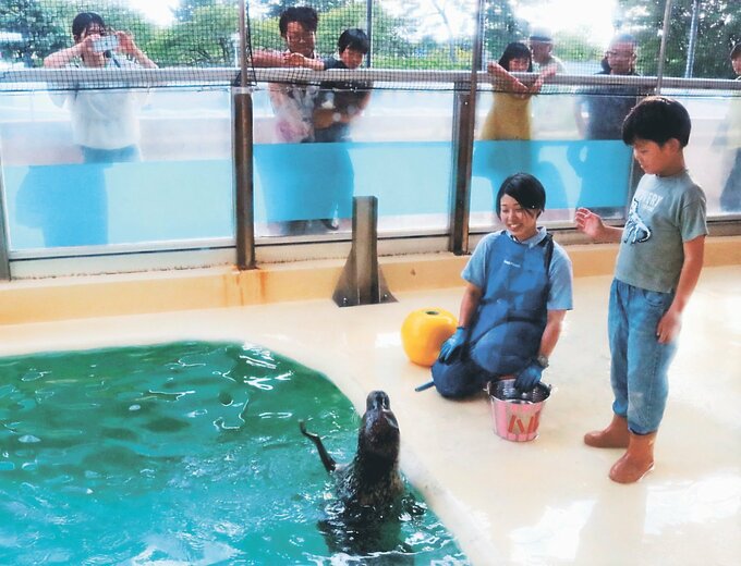 魚津水族館の七夕イベント「うおすいで夢叶(かな)えちゃおう!」は23日、富山県魚津市三ケの同館であり、長野県佐久市から訪れた正木惟太さん(8)の家族がアザラシとの触れ合いを楽しんだ。