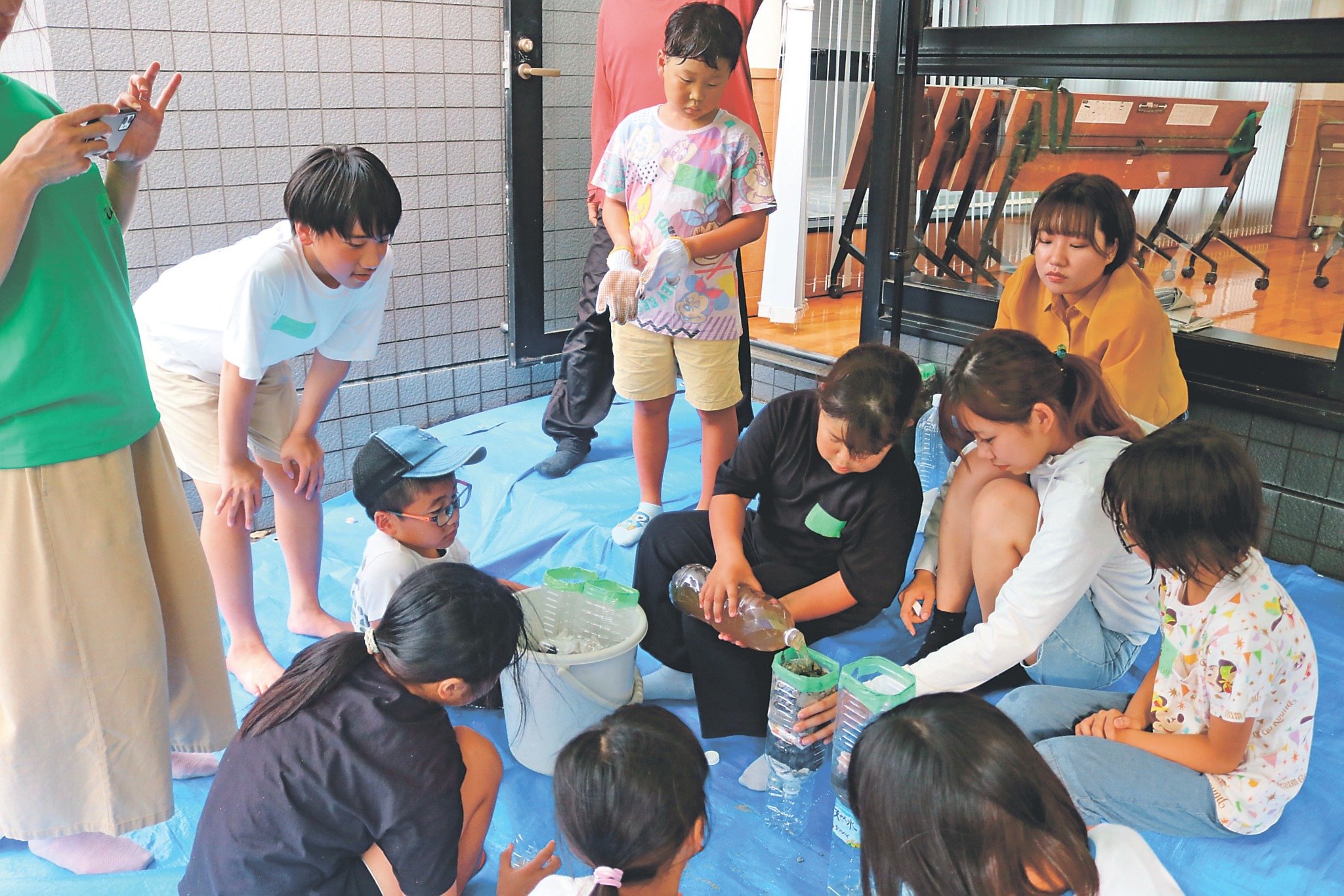 舟橋小5年の折橋凪子(なこ)さん、杏子(あこ)さん、同1年の咲子(さこ)さんの3人姉妹は「本当にきれいな水になるのか分からない」と半信半疑だったが、濁った水が少しずつ透明になり驚いていた。野外活動に詳しいスタッフに教わりながら、さらに水をきれいにする改善策も考えた。