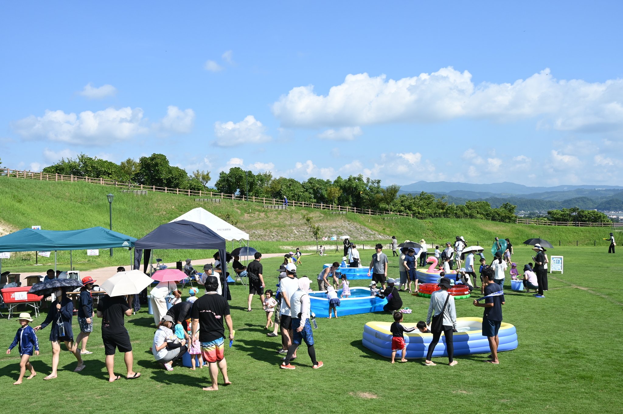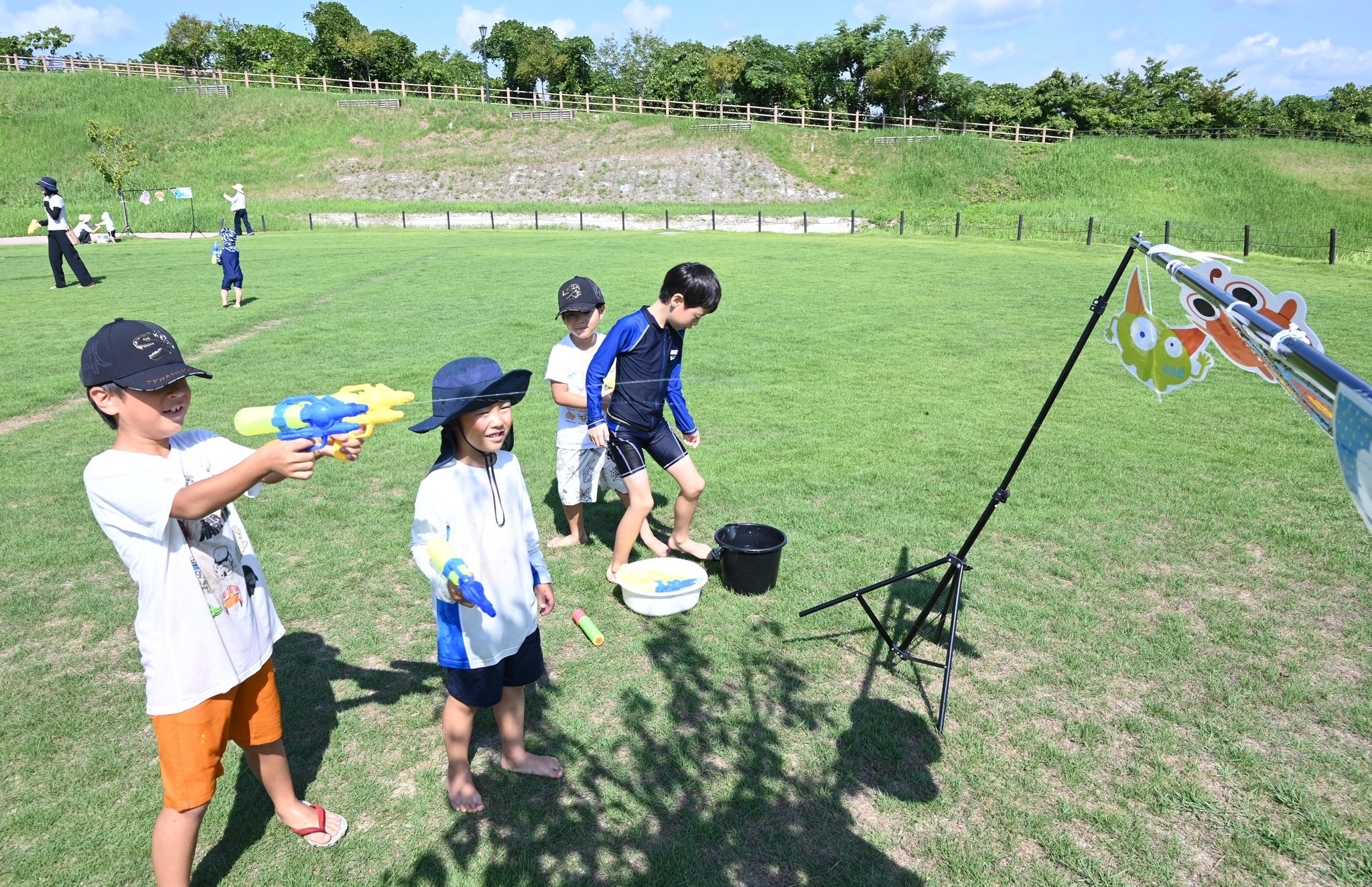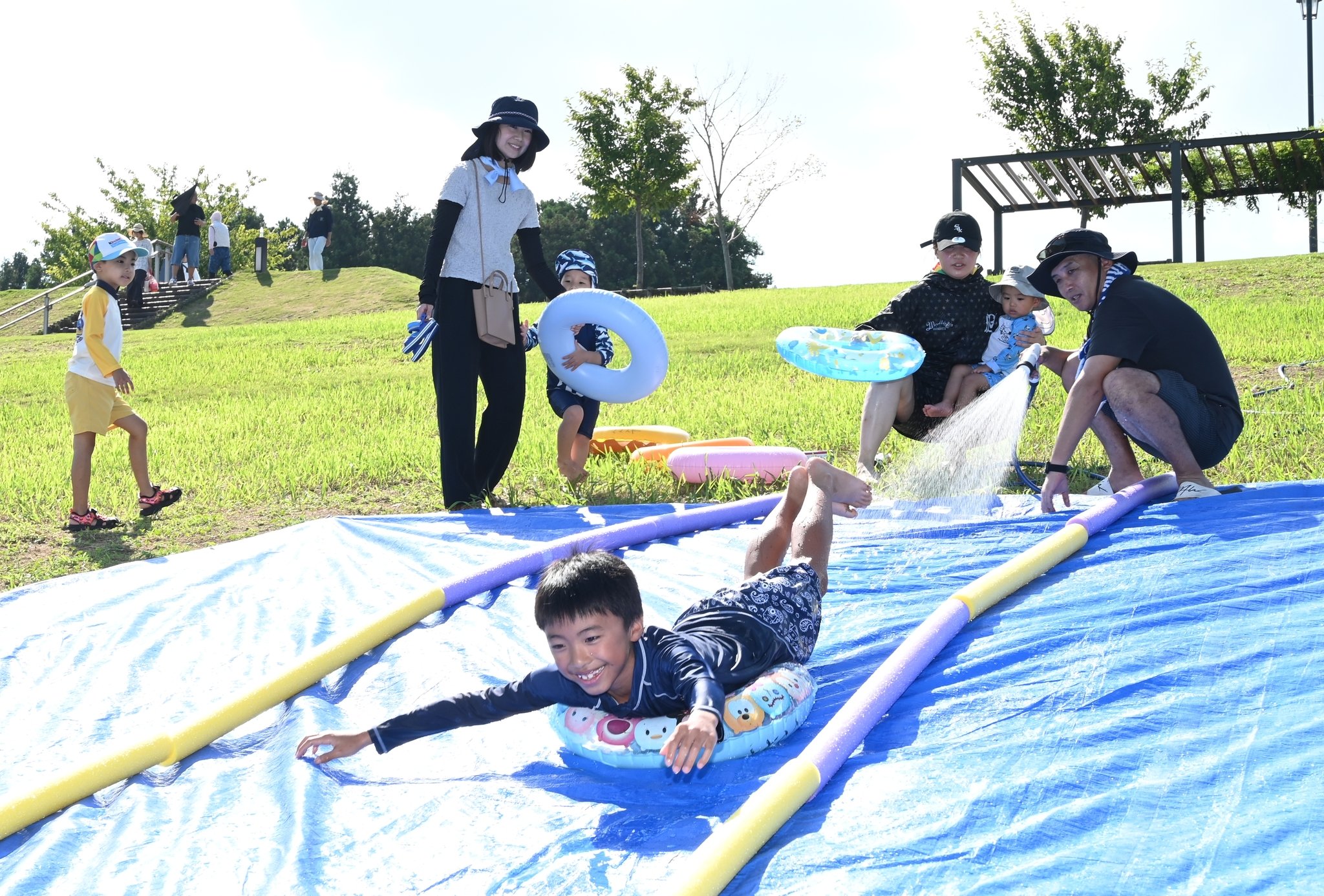 安心して水遊びを満喫してもらおうと、0~1歳児用を含む大小12のビニールプールを芝生広場に用意した。斜面にビニールシートを敷いて長さ約5メートルのスライダーを特設したほか、水鉄砲による的当てや、水の掛け合いができる「水合戦」コーナーも設けた。