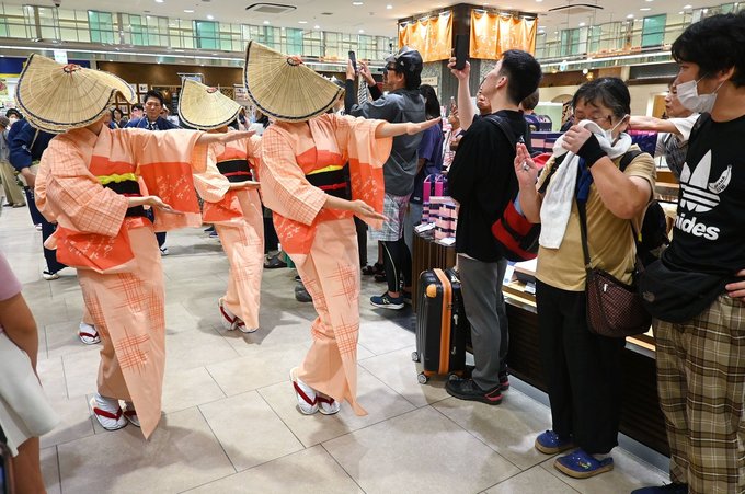 9月1~3日の「おわら風の盆」を前に、富山の玄関口、富山駅でもおわらを楽しんでもらおうと「おわら風の盆前々々々々々々々夜祭」が24日、駅構内の商業施設「とやマルシェ」などで開かれた。大勢の買い物客や観光客が、優美な演舞を楽しんだ。