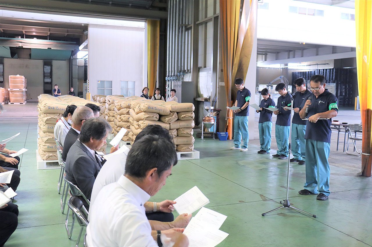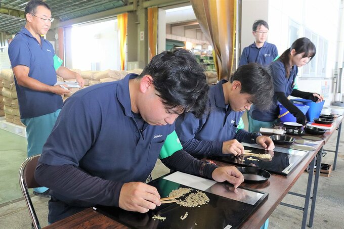 16~20日に収穫された30キロ入り360袋を農産物検査員5人が検査。粒ぞろいや水分、大きさなどを入念に調べた。土田英雄組合長は全量1等維持の結果について「農家の水管理と防除の徹底で高温障害やカメムシの被害をある程度回避できた」と話した。