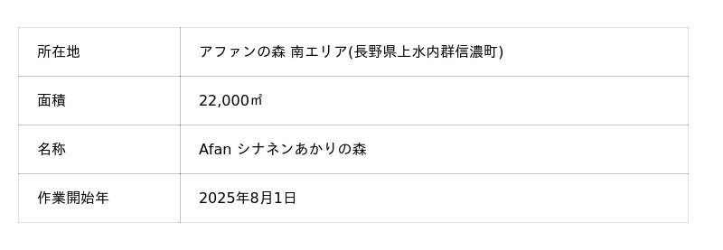 エネルギー・住まい・暮らしの総合サービス事業を提供するシナネンホールディングス株式会社(本社:東京都品川区、代表取締役社長:中込 太郎)の子会社で、エネルギーソリューションを提供するシナネン株式会社(本社:東京都品川区、代表取締役社長:小松良則)は、一般財団法人C.W.ニコル・アファンの森財団(所在地:長野県上水内群信濃町、理事長:森田いづみ)と引き続きオフィシャルスポンサー契約を継続しながら、このたび新たにアファンの森財団が所有する未整備のエリアの一部(22,000平方メートル )を「Afan シナネンあかりの森」としネイチャーポジティブに寄与できるよう生物多様性の回復を目指した森の再生への支援を開始したことをお知らせいたします。