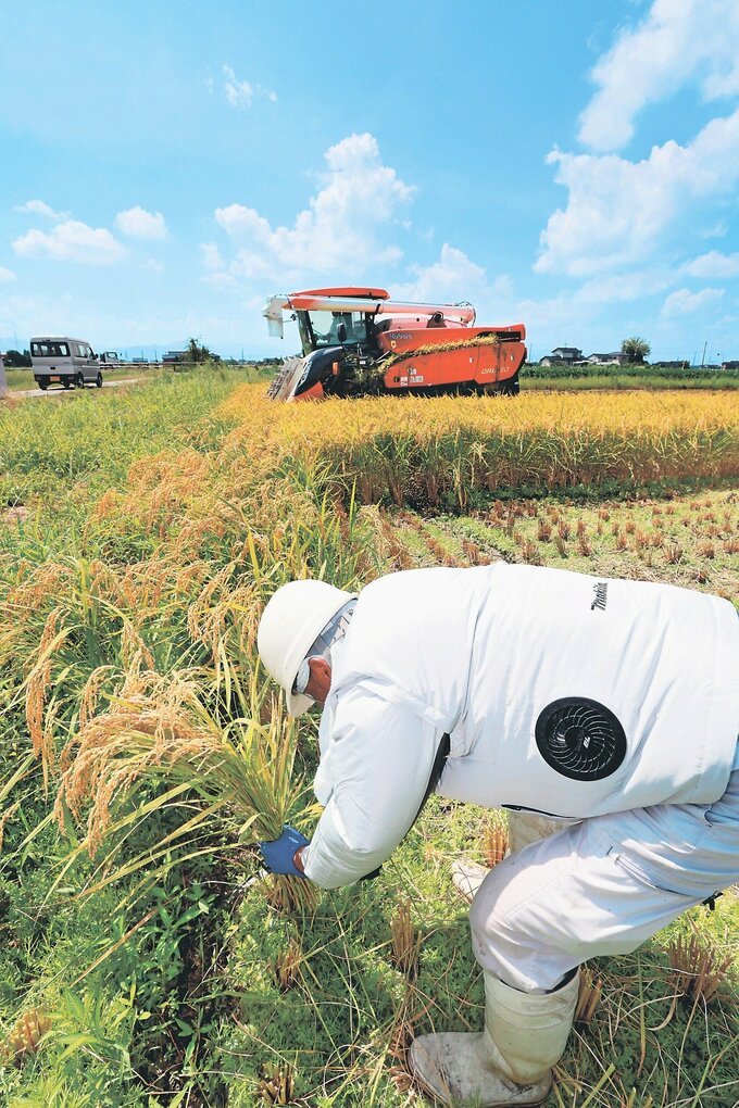 厳しい残暑が続く中、高岡市西藤平蔵のクボタファーム紅農友会は同日から、コシヒカリの収穫をスタート。同社は暑さ対策として2年前からファンの付いた「空調服」を導入しており、青空の下、空調服を着用した従業員が刈り取りに励んだ。卸売業者を通じて9月初旬には県内のスーパーで販売される見込みという。
