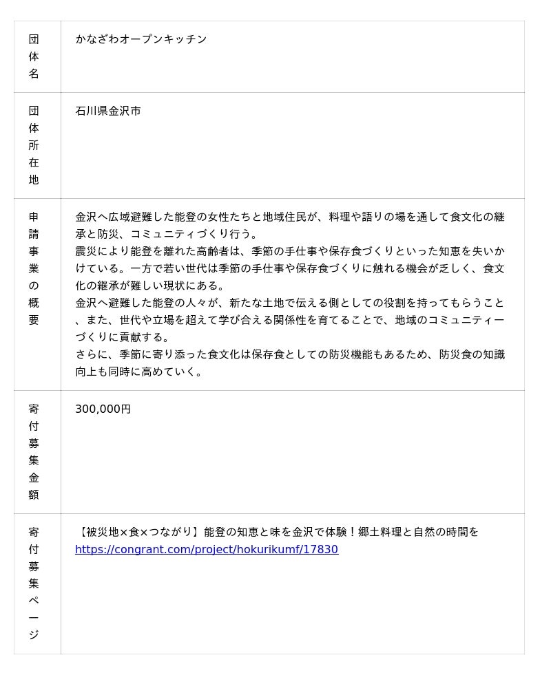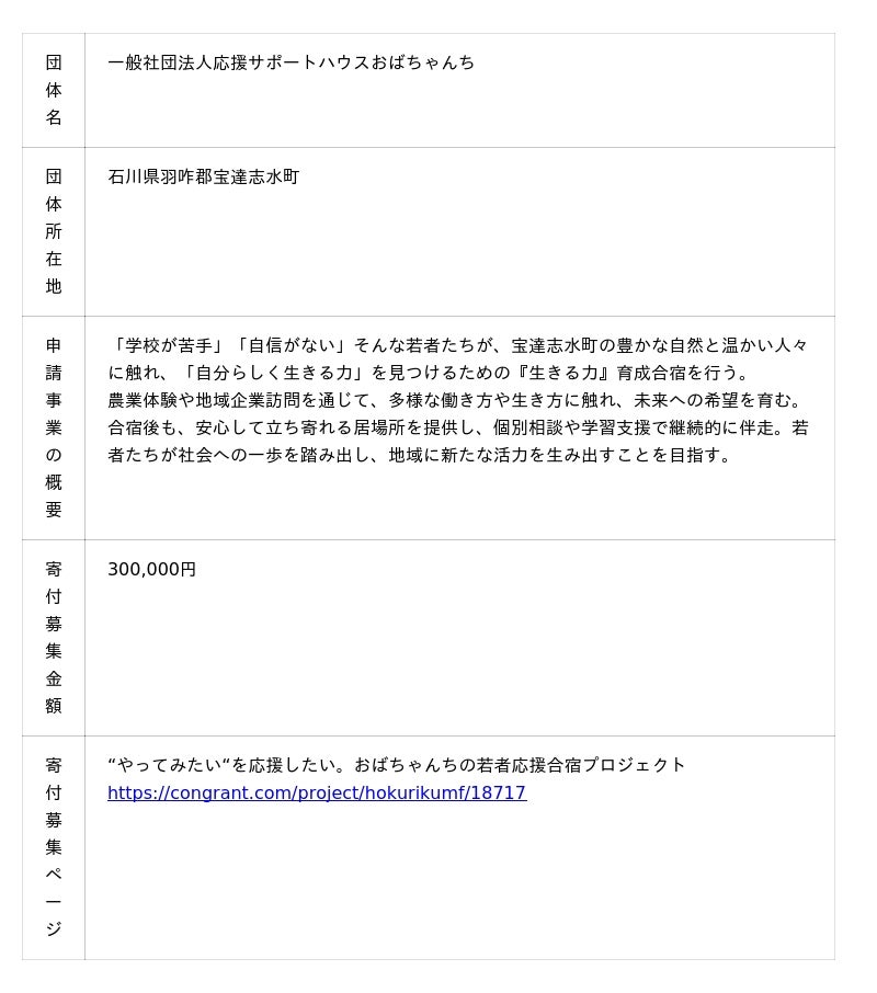 公益財団法人ほくりくみらい基金(所在地:石川県金沢市、代表理事:永井三岐子)は、 「プロジェクト応援寄付」のチャレンジ団体の公募情報を公開しました。