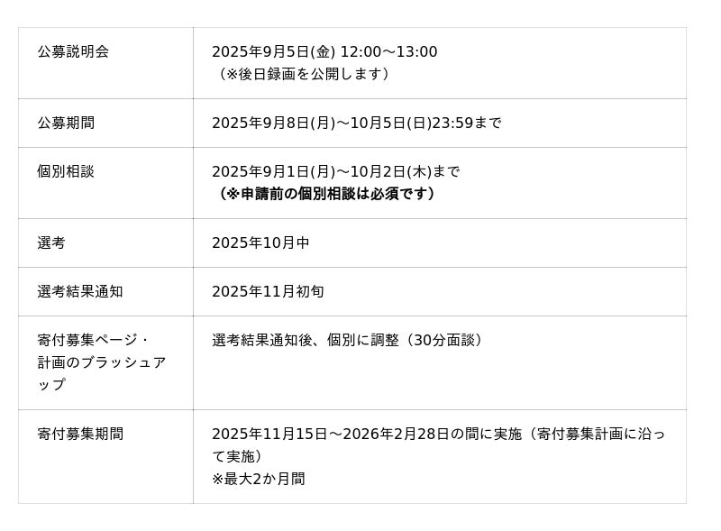 公募に際して、9月5日(金) 12:00~13:00にオンラインにて説明会を開催します。説明会への参加は任意となりますが、申請を検討されている方はぜひご参加ください。(当日参加ができない方向けに、後日録画を公開します)