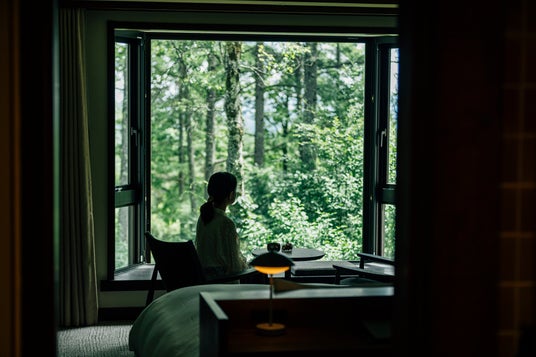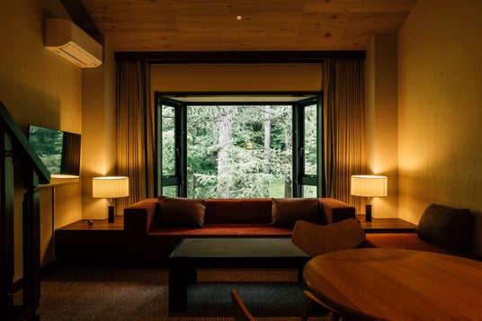 大きな窓の外には四季折々の景色。風に揺れる梢のさざめき、小川のせせらぎ、小鳥のさえずりが、滞在を静かに彩ります。