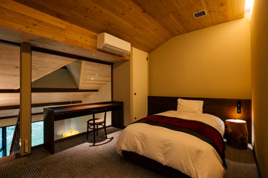 天井・壁面・家具・巾木に至るまで地域産カラマツ材を随所に採用。やわらかな木の香りと手ざわりが、滞在に深い安らぎをもたらします。