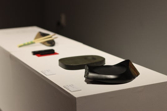 会場の一角では、硯刻家・名倉達了氏による遺書をしたためるインスタレーションも展示されました。墨の香りと光の演出に包まれた空間で筆をとる来場者の姿もあり、日常では意識しづらい自らの人生や伝えたい思いに向き合う時間となっているようでした。