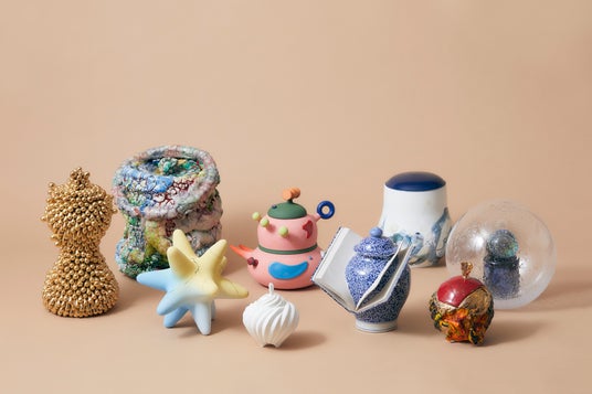 左上から時計回りに:時(トキ)|横山玄太郎、Heritage series 2025 骨壺「始まりの器」|酒井智也、ghost _ prism star # 01|野田ジャスミン、Fantasy Universe 時空|ノグチミエコ