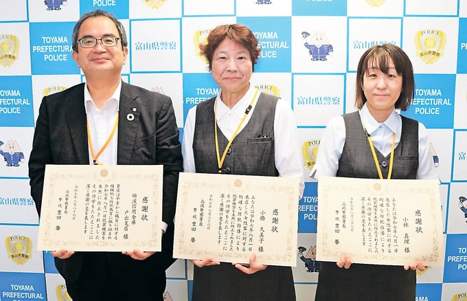 富山県の高岡署は26日、特殊詐欺被害を未然に防いだとして、砺波信用金庫戸出支店(中谷良夫支店長)と職員の小橋久美子さん(67)、小林真理さん(51)に署長感謝状を贈った。
