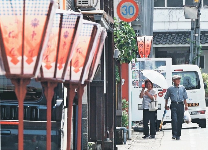 9月1日から「おわら風の盆」が始まる富山市八尾町ではぼんぼりが並ぶ通りに日差しが降り注ぎ、日傘を差した人が歩く姿が見られた。