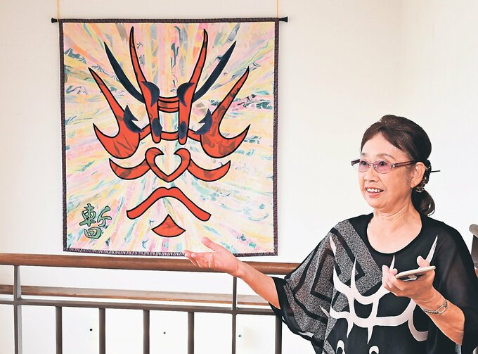 和裁縫製「ラポージェ」(同市泉)の会長、白石末子さん(79)が丁寧にミシンで縫い上げた作品で、縦1.97メートル、横1.87メートル。タイトルは「暫(しばらく)」で、歌舞伎の隈(くま)取りがモチーフになっている。