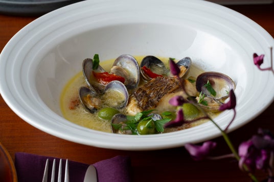・真鯛のアクアパッツァ セミドライアメーラトマトとリュードヴァンの白ワイン