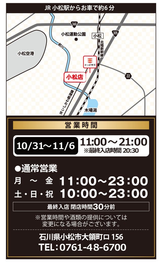 ■■■店舗概要■■■正式名称:かっぱ寿司 小松店