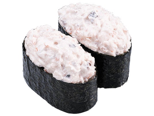1984年、かっぱ寿司の創業地・長野県で“まかない”から生まれた一品。従業員のあいだで評判となったその味は、お客様向けに商品化され、以来多くのお客様に愛され続けてきました。イカゲソ・カニカマ・マヨネーズを絶妙なバランスで合わせた、“クセになる味”が最大のこだわりです。わさびをのせてしょうゆを少々、ガリをトッピング、穴子の甘だれをかけるなど、味変を楽しむファンも多く、アレンジを見つけられるのも魅力です。