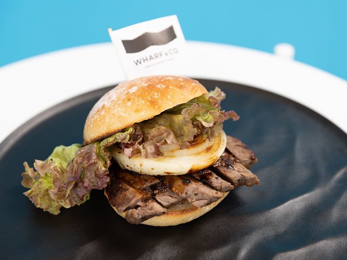 「氷見牛ステーキハンバーガー」(1,980円) 氷見牛ステーキが豪快にはみ出すぜいたくな一品。ダイレクトに肉のうまみを味わえる