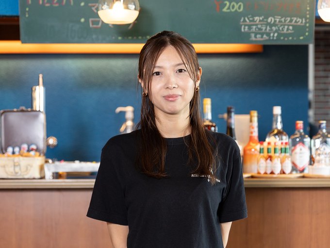 頬張れるのか。「チーズ和牛バーガー」の厚さは12cm。目の前にすると圧倒される。スパイシーなマヨネーズを内側に塗ったバンズに、チェダーチーズとパテ、ピクルス、みじん切りの玉ネギ、トマト、レタスをサンドしている。手にするとずっしりと重い。店長の太田和志さんは「ぐっとつぶして、がぶっと食べて。ハンバーガーの醍醐味(だいごみ)を感じてほしい」と笑う。全ての具を同時に口にすると、よりおいしいという。