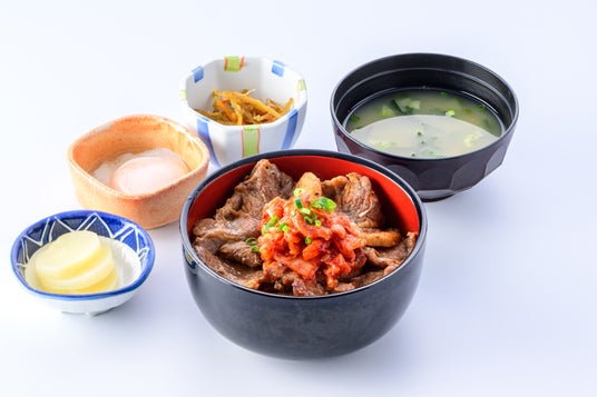 ピリ辛スタミナ豚丼(小鉢・味噌汁・漬物・温泉卵付)