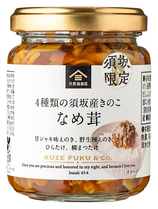 4種類の須坂産きのこ なめ茸(125g)2種類のえのき、ひらたけ、やなぎまつたけ、須坂産のきのこ4種類を贅沢に使用。きのこの存在感がしっかり残った新食感なめ茸。